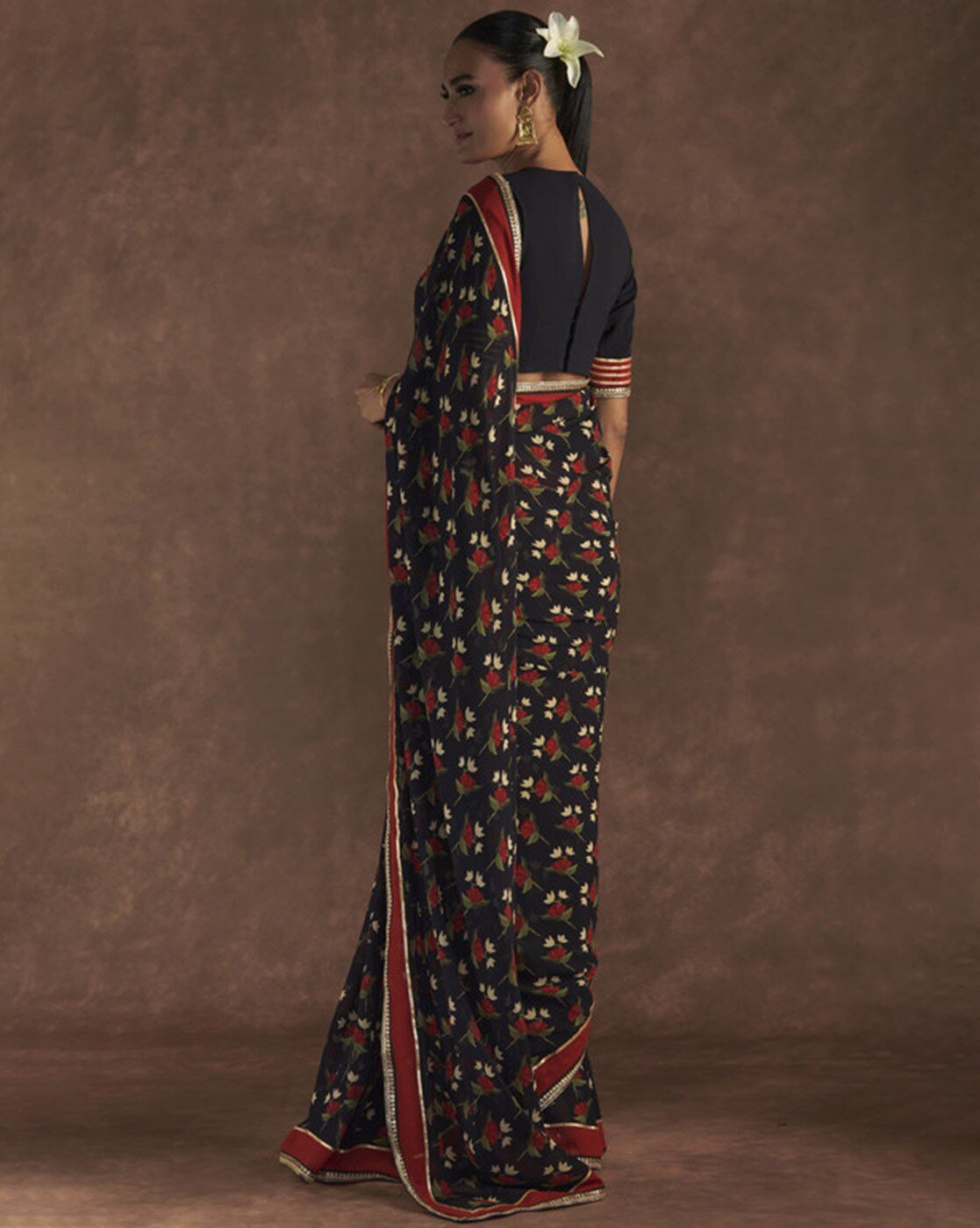 - Black all over georgette print saree with a solid maroon and gota accent as border. The saree comes with a blouse piece which has gota detailing.