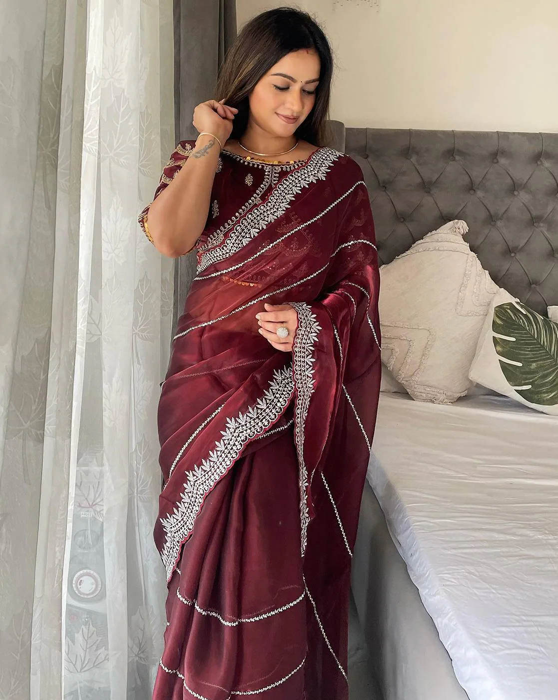 • The last image gives a detailed look of the blouse piece that comes with this saree (The model is wearing a blouse from our in-house wardrobe)