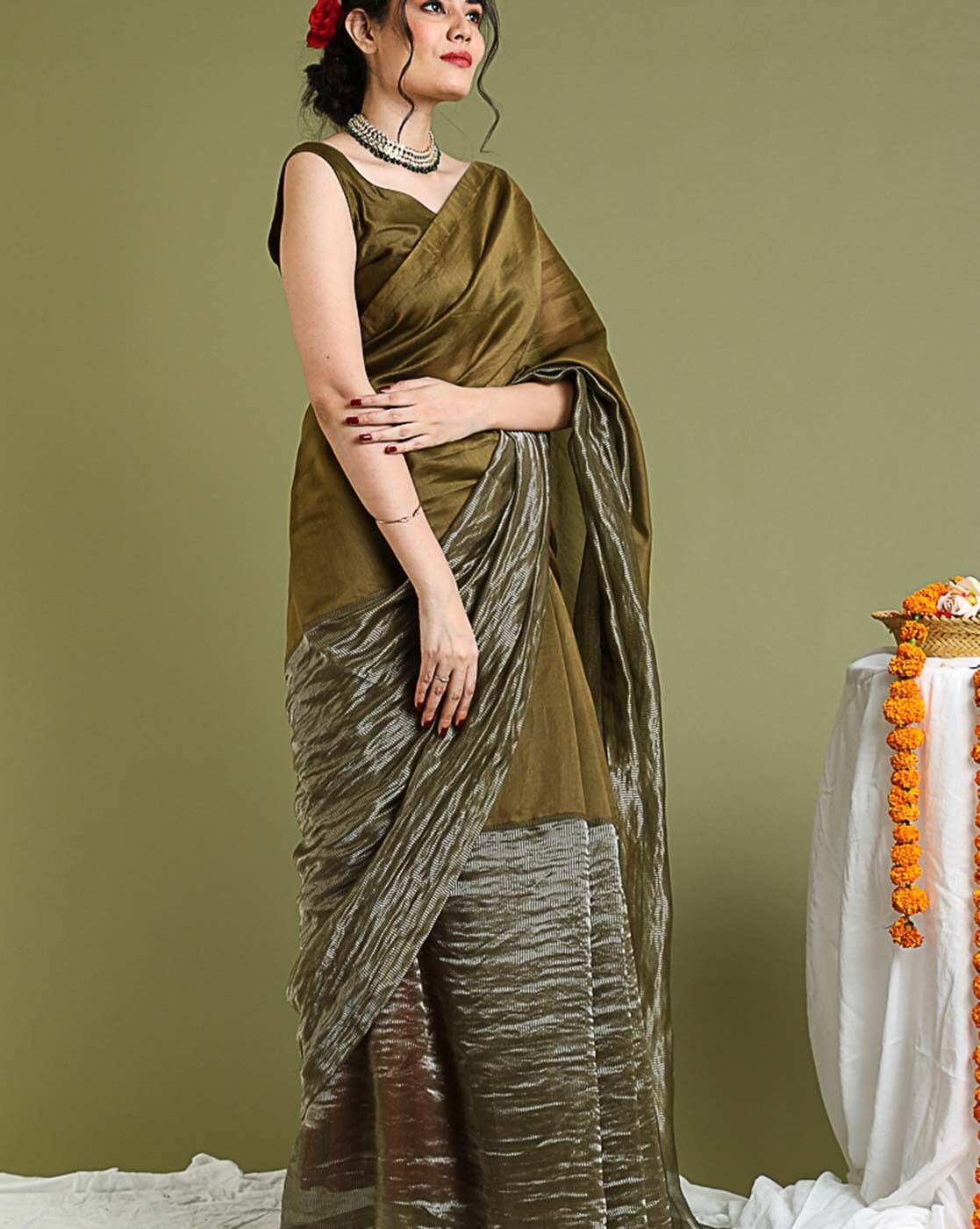 • The last image gives a detailed look of the blouse piece that comes with this saree (The model is wearing a blouse from our in-house wardrobe)