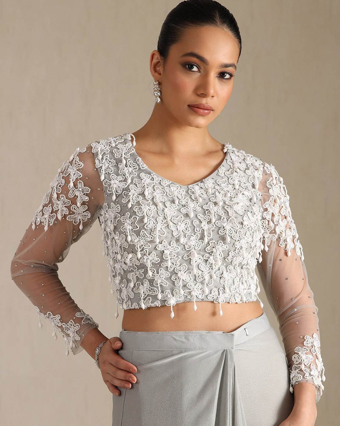 • The last image gives a detailed look of the blouse piece that comes with this saree (The model is wearing a blouse from our in-house wardrobe)